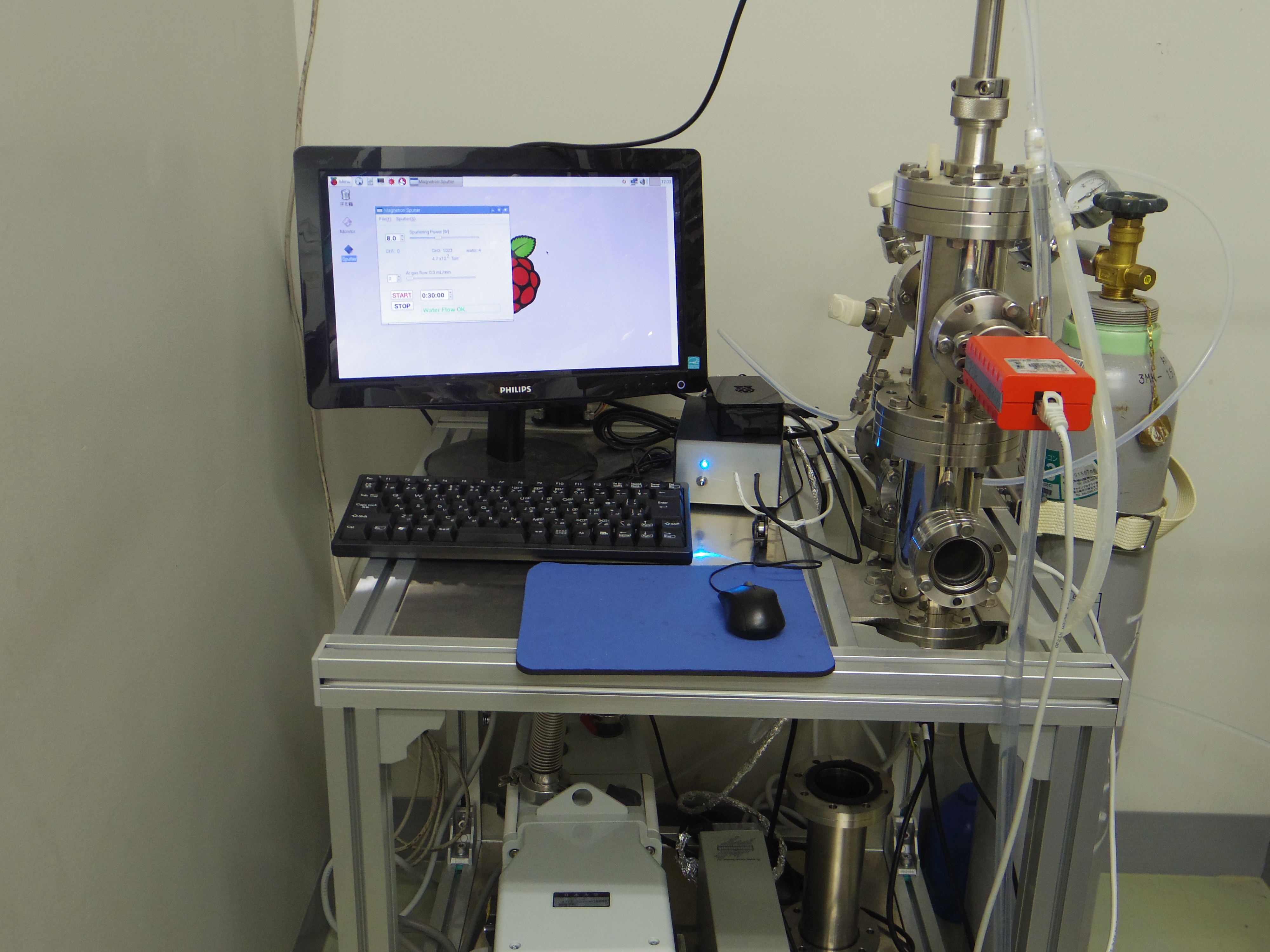 マグネトロンスパッタ法という金属の蒸発手法を用いて、ナノ粒子を合成する実験装置を制御するのにRaspberry Piを使っています。真空計やアルゴンガスの流量コントローラーをADコンバーターとDAコンバーターを通じてRaspberry Piと接続し、直流高圧電源はUSBで直接コントロールしています。
